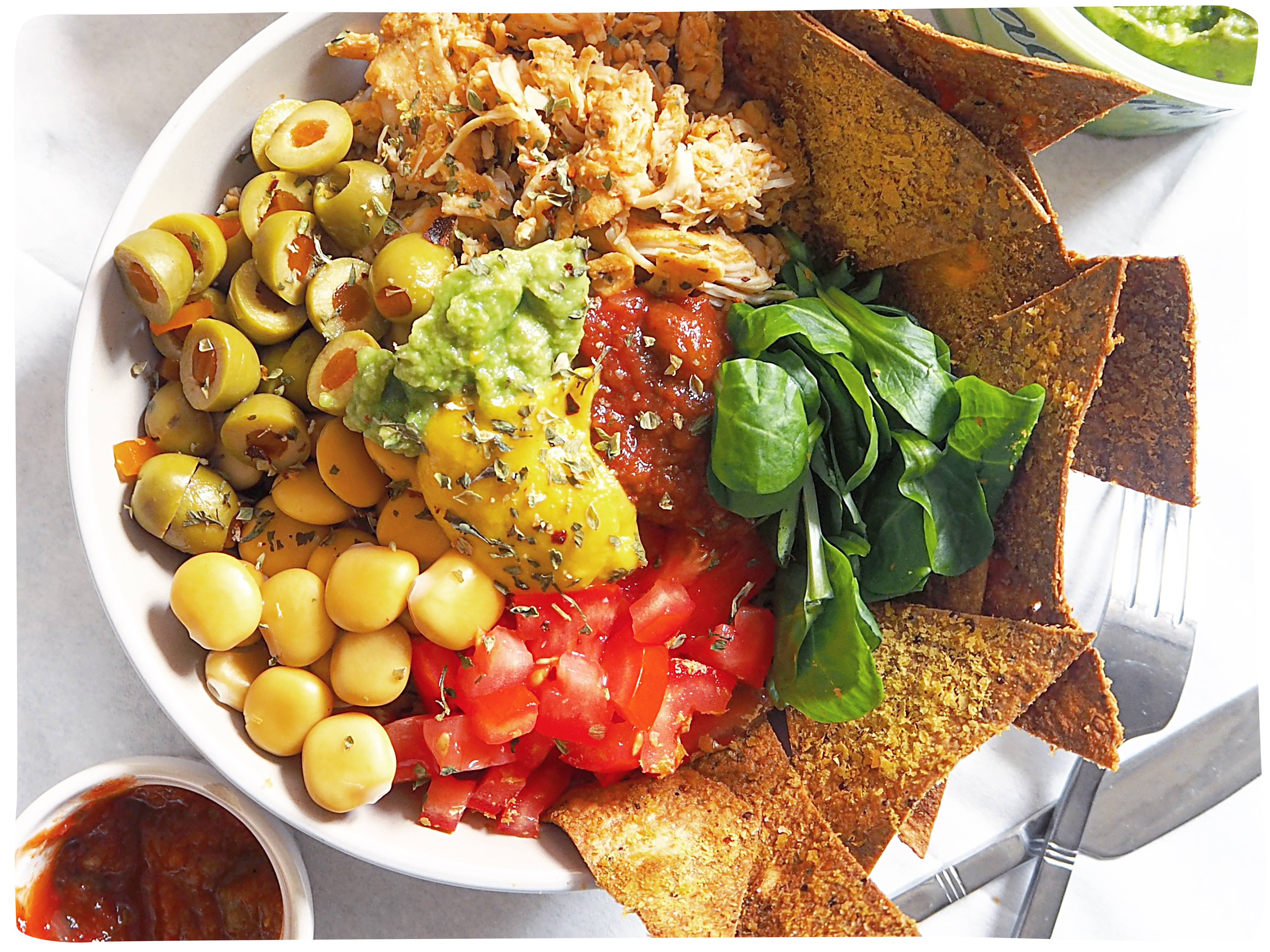 100g Uncle Bens Brown Rice 100g Hacendado Oven Roasted Chicken pieces 25g Lupin Beans 25g Pimiento Stuffed Olives 20g Lambs Lettuce 2 Salad Tomatoes (chopped) 15g Hacendado Guacamole 20g Doritos Mild Salsa Pinch of salt and mixed herbsVegan Cheese (optional) ‘Cheesy Nachos’ (optional)
